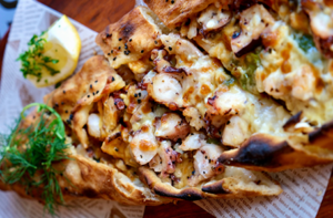 Handmade Turkish dumplings filled with seasoned beef steamed and glazed with herb butter, topped with thickened garlic yoghurt